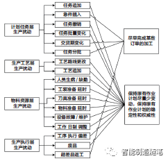 动态调度决策分析的目标是在实时掌握生产现场资源使用情况、已有作业计划的执行情况等基础上,通过对作业计划的动态调整使作业计划与生产现场的实际制造执行状态保持一致,始终保证对现场的指导性。在这个过程中,需要响应来自计划任务、生产工艺、物料资源、生产执行等层次的生产扰动,以实现快速的响应调整[3]。典型的生产扰动因素及其调整要求示意如图2所示。