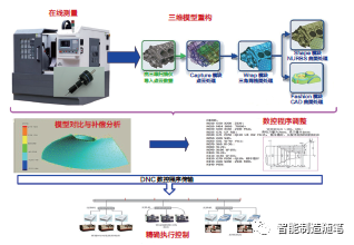 (1)在线测量:针对复杂零件的典型特征,通过在线切换测量头的方式,获得加工过程中的特征尺寸点云数据,并将该数据进行传输以作为补偿分析的依据;