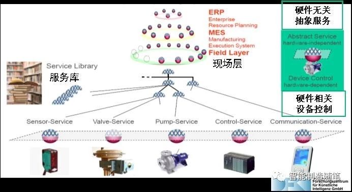 图4是德国工业4.0的典型资料图片,其所表达的含义是生产线中所有的硬件单元都有对应的软件形式的服务,比如传感器服务、控制服务、通讯服务、校验服务、信息服务等,整个CPS网络系统就是一个服务连接网络,具有“服务联网”的概念,这些服务有层次并且能够动态组合配置[4]。所谓的智能管控,体现为硬件资源的离散化,通过服务化封装,实现业务资源链条的重构与控制,并可以进一步的支持“软件定义制造”理念的落地。其在自动化生产线硬件之上构建的服务联网系统,具有明确的数字孪生内涵。