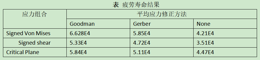 为充分考虑寿命影响因素,分别使用Signed Von Mises、Signed shear、Critical Plane三种不同的应力组合方法,古德曼和格伯平均应力修正方法并考虑了不使用应力修正方法,基于以上方法进行组合寿命计算,最后得出9组疲劳寿命结果,见下表。当应力组合采用剪切应力方法时疲劳寿命结果要略小于其他应力组合方法。