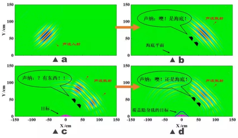 a:一束声波正以45度向下斜入射到海底;b:经过海底反射,声波仍然保持一束,以45度向右上方传播;c:如果海底存在一个凸起的目标物体,声波经过目标的散射后,会分裂成两束,并向两个不同的方向扩散;d:给目标物体覆盖一层隐身毯,此时声波又合成一束,并且向右上方45o传播,传播状态与b图接近。