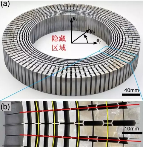 基于上述原理,北京理工大学胡更开教授的团队制作出了环形隐身衣(下图)。这种隐身衣能引导绝大多数声波能量偏离绕行,只有极少数声波进入隐藏区域,从而保证目标物体不被探测发现。