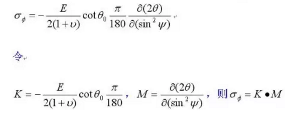 其基本原理是:当试样中存在残余应力时,晶面间距将发生变化,发生布拉格衍射时,产生的衍射峰也将随之移动,而且移动距离的大小与应力大小相关。用波长λ的X射线,先后数次以不同的入射角照射到试样上,测出相应的衍射角2θ,求出2θ对sin2ψ的斜率M,便可算出应力σψ。