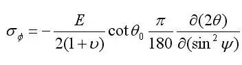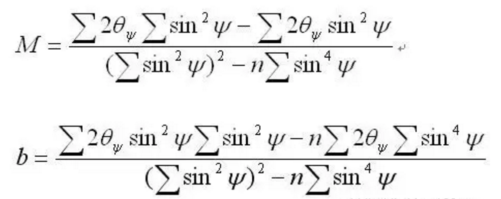由布拉格方程可知,θ角越大则起测量误差引起△d/d的误差越小,所以测量时应选择θ角尽量大于衍射面。取n个不同的ψ角度进行测定2θi(i=1,2,3,…,n),一般可取n≥4, 采用数据处理程序对2θΨ的原始测量数据进行扣除背底、数值平滑、确定峰位等处理后给出2θΨ值然后采用最小二乘法将各数据点回归成直线:设直线方程为:其中: