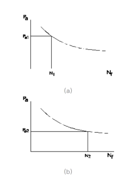 - 如果载荷只是由前页较大幅值Pa1 组成,可从耐久曲线图(a) 中得到,当循环次数n1 等于破坏时的循环次数N1时,零件发生破坏。显然,此时n1/N1=1。同理,如果载荷只是由前页较小幅值Pa2 组成,由图(b)有,破坏时n2/N2=1。