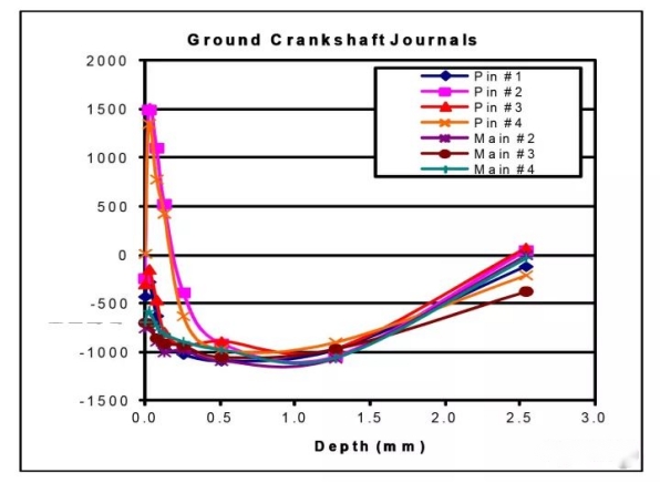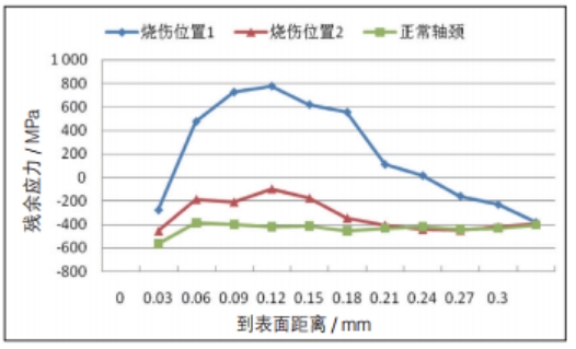 主轴承和曲柄颈表面通常需要精密研磨来达到设计的尺寸精度和表面光洁度。研磨产生的残余拉应力对研磨加工后的轴颈的使用寿命有很大的影响,可通过X射线衍射法对其进行应力测定。研磨产生的最大拉应力通常位于研磨面的近表层。为了表征研磨产生的残余应力,通常需要在次表层沿深度方向进行应力分布测定(见图2)。