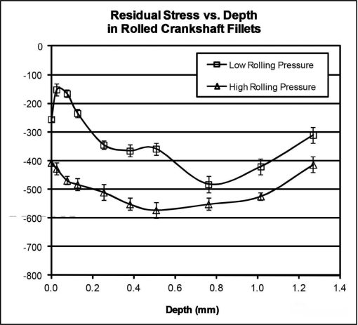 在曲轴不同制造阶段测定次表面的应力,可用来评估每一步制造工艺对表面的影响。研究曲轴残余应力产生机理,可用于优化产品设计和制造工艺,在制造高质量零部件的同时,降低生产成本。